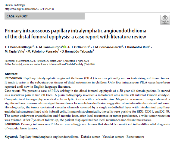 NUEVO ARTICULO A 16 ABRIL 2024: Primary intraosseous papillary intralymphatic angioendothelioma of the distal femoral epiphysis: a case report with literature review.