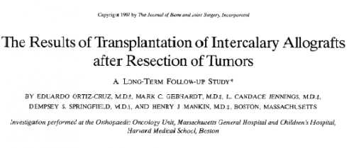 Ortiz-Cruz E, Gebhardt MC, Jennings LC, Springfield DS, Mankin HJ: “Results of Intercalary Allograft Transplants for Tumors. A long term follow up study”. The Journal of Bone and Joint Surgery. Vol. 79-A, No 1: 97-106, 1997